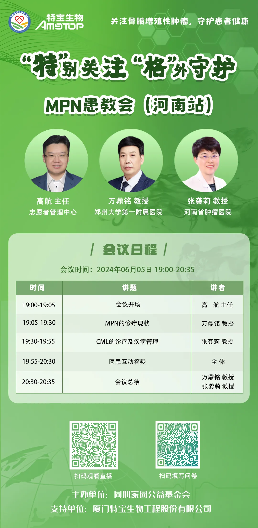 为助力MPN疾病诊疗的进一步发展,同心家园公益基金会开展了“‘特’别关注,‘格’外守护-MPN患教会”活动,会议特别邀请国内血液领域的权威专家为大家带来关于MPN诊疗知识的科普讲座。专家们将运用丰富的临床经验和医学知识,通俗易懂的语言,让患者及家属对MPN有更加深入的了解。此外,活动还设置了“医患互动答疑”环节,解决患者心中疑惑,增加患者治疗信心,进一步促进医患之间的相互理解和信任。