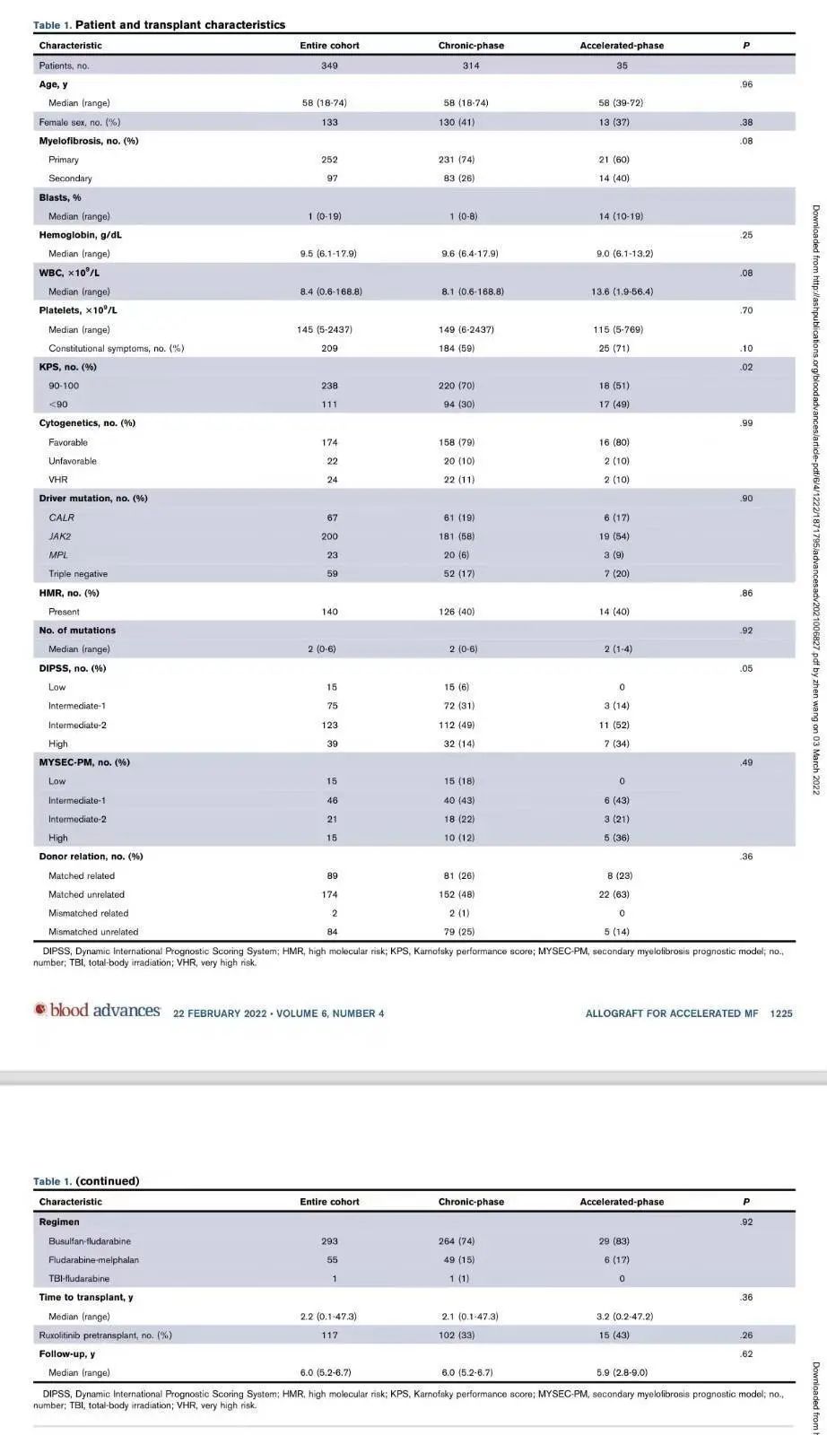 共分析了349例临床和基因诊断的原发性或继发性骨髓纤维化患者接受降低强度移植的结局,其中35例为加速期骨髓纤维化。与慢性期(10%原始细胞)骨髓纤维化相比,加速期组的中位白细胞计数更高,更多患者出现全身症状,RAS突变的检出率更高。(表1)