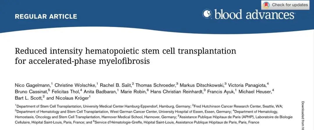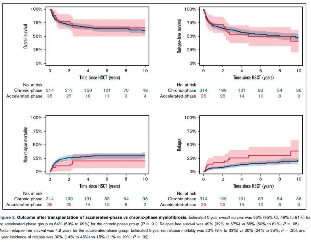 本文是加速期骨髓纤维化的首次报告,结果可能鼓励临床医生为这些患者进行治愈性治疗。该研究表明,对于加速期骨髓纤维化的患者,降低强度移植显示出极好的生存率,无既往细胞减灭术的加速期骨髓纤维化显示5年生存率极佳(65%),但与慢性期相比,复发更高。干细胞移植前旨在减少原始细胞的新型药物是否会降低复发风险,应在临床试验中进行研究。