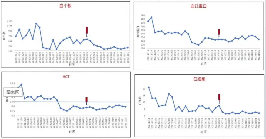 血常规:WBC、PLT迅速降至标准范围,HCT及HGB持续稳定控制。