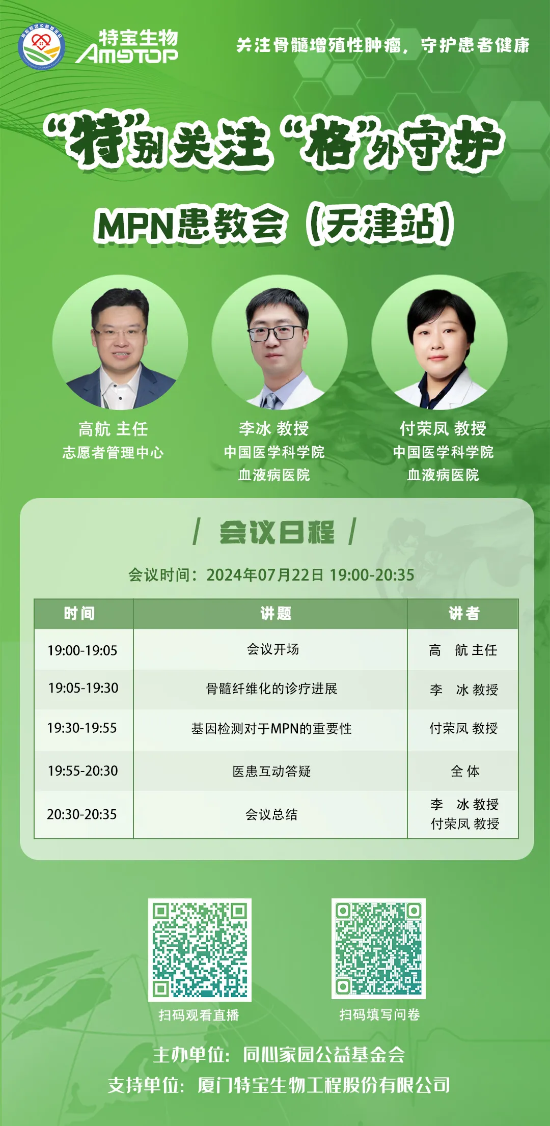 “特”别关注,“格”外守护-MPN患教会系列活动——天津站,将在2024年7月22日19:00-20:35于线上举办。本次会议特别邀请到中国医学科学院血液病医院的李冰教授和付荣凤教授与会,分别以“骨髓纤维化的诊疗进展”和“基因检测对于MPN的重要性”为题,为患者讲解MPN相关诊疗知识,并对患者提出的相关问题进行答疑。