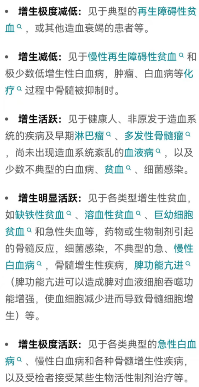 ②骨髓增生程度:骨髓是我们成人后的造血器官,它里面的造血干细胞需要不停得“增生”,这样才能补充血液里死去的细胞。但是对于“增生”,有“程度”和“质量”两个要求,程度不对,会间接影响质,会生出异常细胞。
