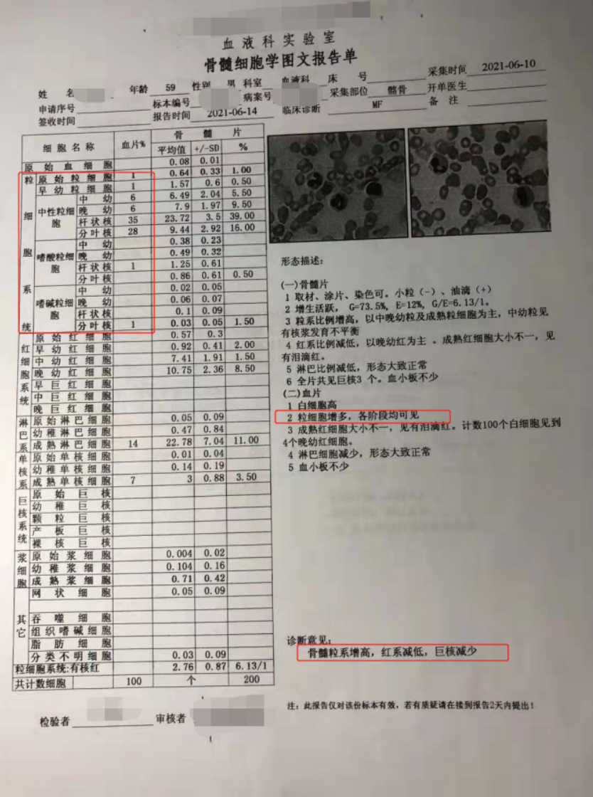 ①原始血细胞:是指骨髓中最原始阶段的血细胞,正常情况下,骨髓中的原始细胞<细胞总数的5%,超过5%属于病理状态,比例越高越接近白血病,>20%即达到急性白血病标准。因少数骨髓增殖性肿瘤(MPN)患者可进展为急性白血病,提醒MPN患者要重点关注这一指标。