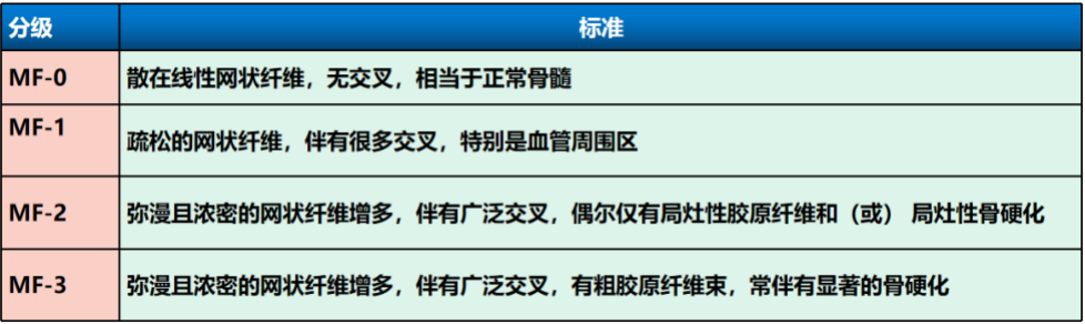 ①原发性骨髓纤维化(PMF):骨髓穿刺常呈“干抽”状态,疾病早期骨髓有核细胞增生,特别是粒细胞和巨核细胞,但后期显示增生低下,可伴少量原始细胞,骨髓活检可以看到大量网状纤维组织。