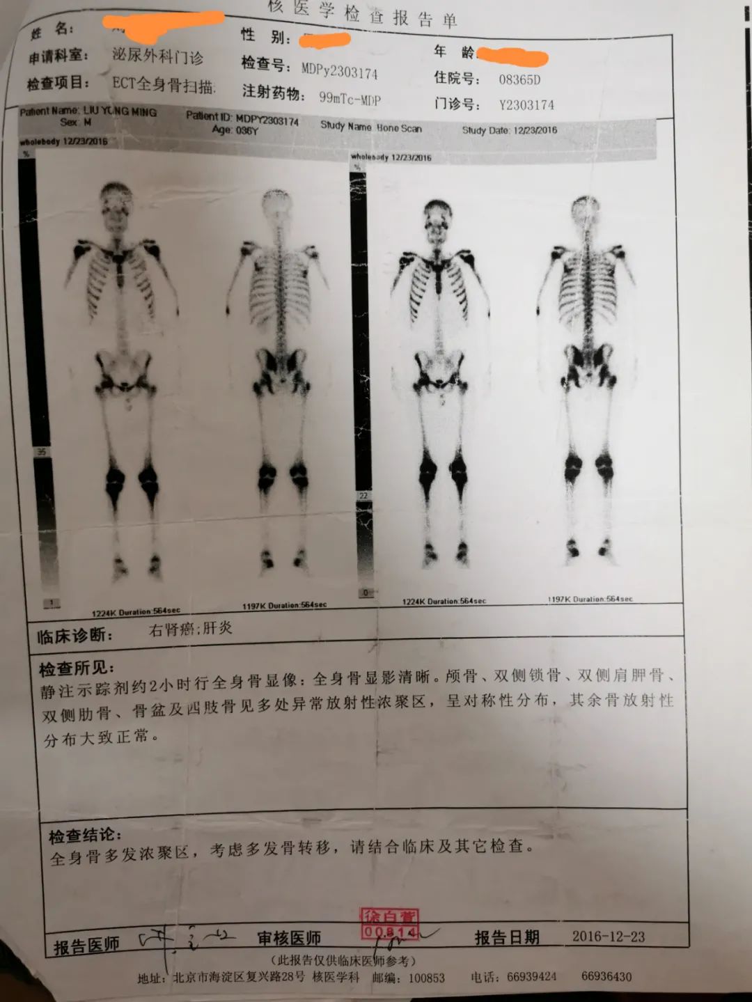 当时我先生没有任何不适,随后多家医院问诊确诊,但我先生不愿意取骨样本查,没有病理做证据。同时北肿、东肿、积水潭都否认了他的骨转移,因为不符合肾癌骨转移特征,而且如果是多处转移,人的状态不可能是当时的好状态。