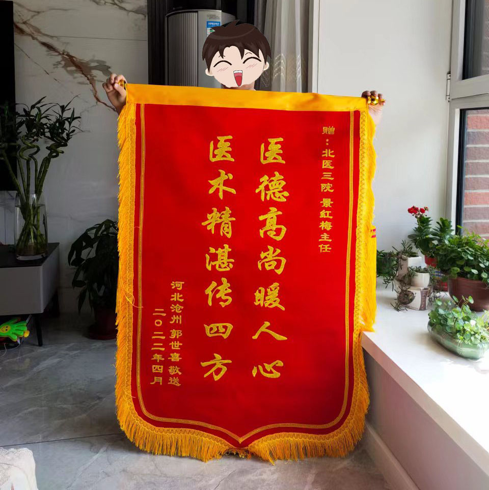 俗话说:滴水之恩将永泉相报,何况是“救命之恩”。所以,我们全家一直都想做点什么来表达帮助父亲重获健康的朋友,尤其是景红梅主任。为此,我们怀着无比感激之情,特意做了一面锦旗。