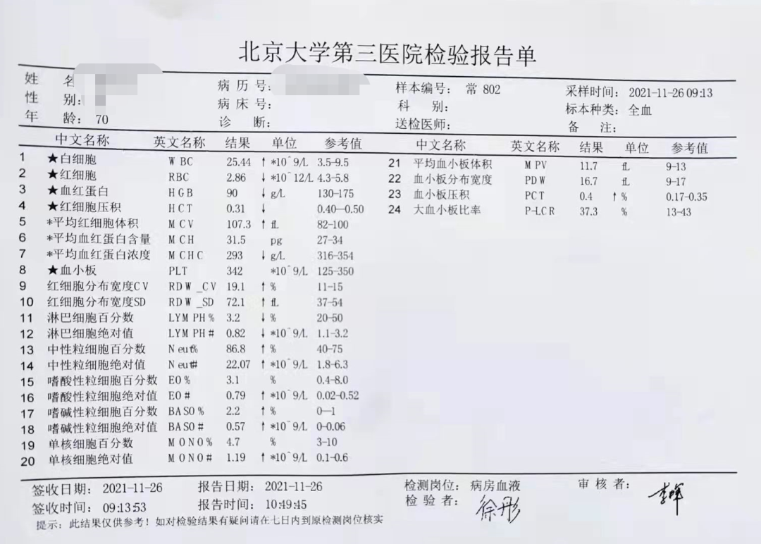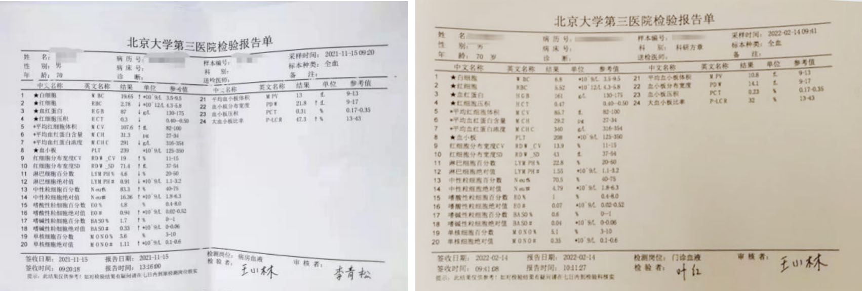 事实证明,父亲是幸运的。从2021年11月26日,父亲入组服用“杰可替尼”,血红蛋白从80多涨到161后,到现在已经好几个月了,再也没有输过血!血常规各项指标也都趋于正常。不止他高兴,相信自己的病就快康复了,我们全家,甚至志愿者们也替他高兴。