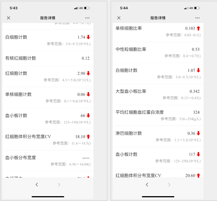 本来想着,瞒着公公让他按医嘱服药,病一定会好;没想到两周后的血常规检查结果让我们几近奔溃——血红蛋白由91降到65;白细胞只有1.55 红细胞由3.6降到2.53 ;血小板只剩66!陪公公看了这么久的病,我们知道:这些数据背后,每个都藏着致命的危险!