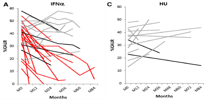 在MPN的治疗中,减少基因突变负荷是一个重要的目标。常用的治疗方法包括使用羟基脲(HU)和干扰素(IFN-α)。其中,干扰素的应用在降低基因突变负荷方面展现出较好的效果。一项针对PV和ET患者的研究显示,干扰素治疗5年后,患者的JAK2V617F突变负荷显著下降,甚至有部分患者的突变完全消失,这被称为“分子学缓解”(图1)。
