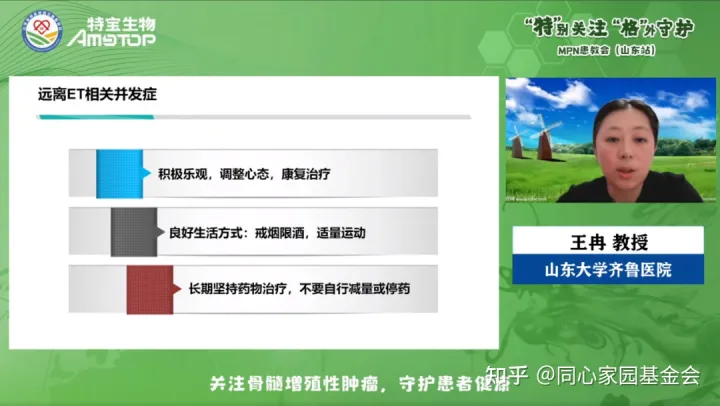 山东大学齐鲁医院王冉教授作出《原发性血小板增多症疾病简介及治疗进展》的专题讲解。从疾病概况、治疗方案等多个方面为病友深入讲解分析,针对临床患者比较关注的几个问题,王教授还特意作出针对性的注意事项指导。