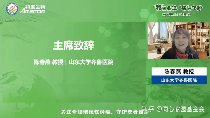 山东大学齐鲁医院陈春燕教授为会议作主席致辞,首先对与会专家和患者表示热烈的欢迎,其次对骨髓增殖性肿瘤(MPN)进行了简单讲解。陈教授讲到:骨髓增殖性肿瘤(MPN)是一系或多系的慢性骨髓来源的恶性肿瘤,常见主要包括:真性红细胞增多症(PV);原发性血小板增多症(ET);原发骨髓纤维化(PMF)这三种。其中原发性血小板增多症的发病率是相关比较高的类型。今晚我们的关注点集中于原发性血小板增多症的治疗和进展,以指导患者坚持规范治疗,避免造成严重后果,让更多患者获益。