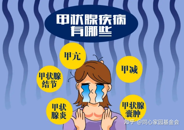 甲状腺疾病主要包括甲状腺功能异常(甲减和甲亢)、甲状腺炎(急性、亚急性和慢性淋巴细胞性又称桥本氏)、甲状腺肿(单纯性和结节性)以及甲状腺肿瘤等。甲状腺疾病会影响全身器官功能,增加糖尿病、心血管疾病的发病风险。