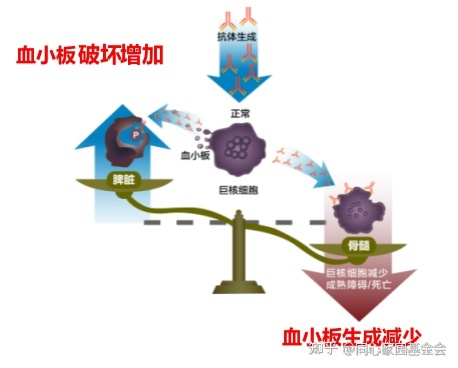 综上所述,这种双重打击的机制会显著降低血小板的数量。既有血小板的过度破坏,又有巨核细胞产生血小板的能力不足。循环往复,产生的越来越少,破坏的越来越多,最终导致疾病的发生。