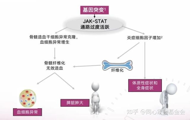 原发性骨髓纤维化(PMF)是由异常造血干细胞的克隆性增殖,导致进行性骨髓纤维化的一种骨髓增殖性肿瘤(MPN)。PMF主要临床表现包括进行性血细胞减少、髓外造血导致脾肿大、全身症状(如疲劳,盗汗,发热)、恶液质、骨痛、脾梗塞、瘙痒、血栓形成和出血等。