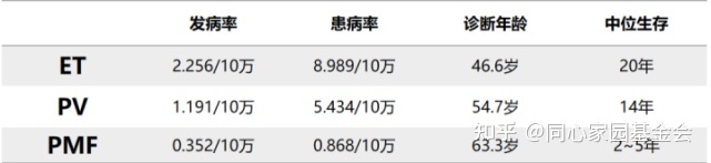 MPN三种最常见的疾病:PV、ET、PMF。据统计,这三种疾病中,ET患者的生存期最长,可达到20年甚至更长,控制好和正常人的生存期没区别;其次是PV,最长生存期为14年;PMF的生存期最短,最长为5年。
