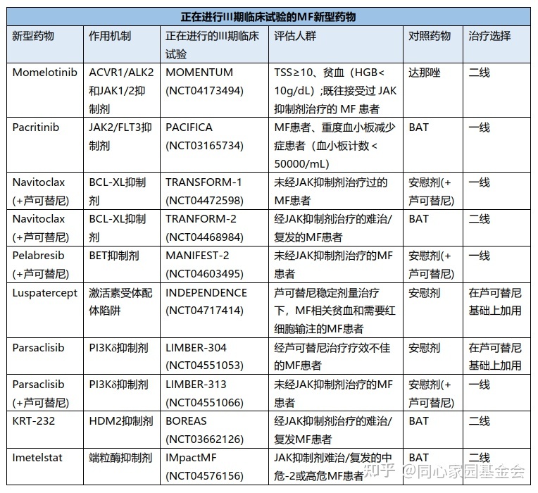 JAK1/2抑制剂单药在MF患者的应用为一系列有前景的各种新型药物(例如BET抑制剂、HDM2抑制剂、BCL-2/BCL-XL抑制剂和端粒酶抑制剂等)的临床开发开创了道路。目前在MF的一线和二线治疗中开展了几种极具前景的候选药物的III期临床试验,这些研究可能加快新型药物的批准,有望改变当前MF的治疗格局。