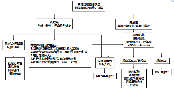 由于目前还没有有效治疗PV的药物,所以现阶段的治疗目标是减轻症状负担,降低发生血栓和出血并发症的风险,同时预防post-PV MF和(或)急性白血病转化。PV的诊疗流程如图:
