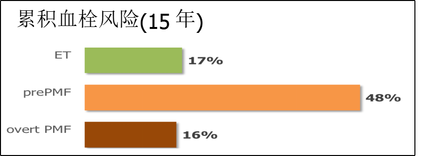 相较于ET患者,prePMF患者的血栓发生率更高,15年累积血栓风险为48%,而ET患者只有17%。静脉血栓(主要是非典型的,如内脏及肠系膜)在prePMF患者中更常见,prePMF患者白细胞计数较高与动脉血栓风险增加相关。