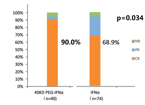 根据研究对比数据可得知,干扰素α治疗达到更高的血液学缓解率,疾病进展的也会更缓慢。