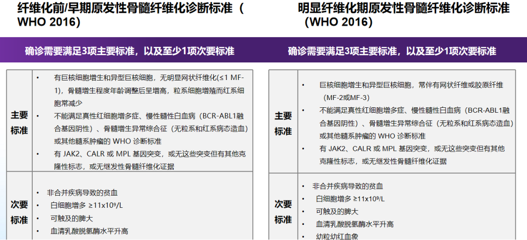 此外,约有85%的PMF的患者有JAK2、CALR、MPL三种基因中其中一种基因的突变,还可能伴有其他如TET2、ASXL1、SRSF2等基因的突变。因此,骨纤维化的基因检测对诊断PMF来说也必不可少。 WHO已经发布了诊断标准(如图),原发性骨纤维化需要满足三项主要标准以及至少一项次要标准才可确诊。