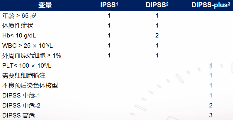 随着时间的推进,医学进入基因诊断的时代,骨髓纤维化患者的预后评估方法也在逐渐演变。在确诊为MF相关疾病后,医生会使用国际预后积分系统(IPSS)、动态国际预后积分系统(DIPSS)或DIPSS-Plus预后积分系统等工具对您的疾病情况进行预后分组,这也是PMF预后评估的经典方法。前者用于初诊患者,后两者可用于病程中任意时间。