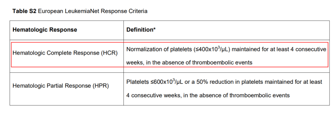 ●伊美司他治疗ET的疗效Baerlocher等[5]开展的Ⅱ期、多中心、开放性临床试验结果显示,本研究纳入的18例难治或者不能耐受常规治疗(包括羟基脲、阿那格雷、干扰素等)ET患者中,16例(89%)患者达到完全血液学缓解(HCR标准:血小板至少连续4周≤400×10^3/µL,无血栓栓塞事件),详见表S2,完全缓解的中位时间为6.1周(见图1)。治疗期间最常见的不良反应包括乏力(83%)、腹泻(78%)、恶心(72%)、头晕(61%)等。