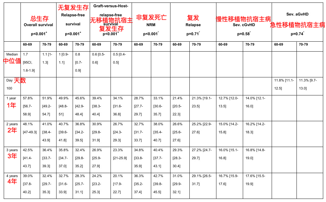 虽然老年患者的预后一般较差,但70岁至79岁的患者与60岁至69岁的患者之间的差异并不大,不足以证明仅凭年龄就不能将其排除在移植治疗之外。