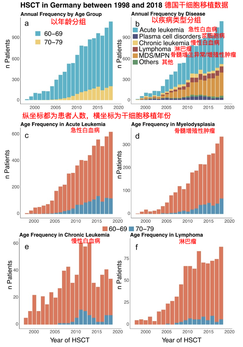 该研究纳入德国在1998-2018期间1547例(70-79岁)和9422例(60-69岁)接受异基因造血干细胞移植的髓系、淋巴系等血液系统疾病患者。纳入标准为这期间≥60岁的因任何恶性疾病接受异基因骨髓或外周血干细胞移植患者,并排除了数据缺失和非第一次移植患者。