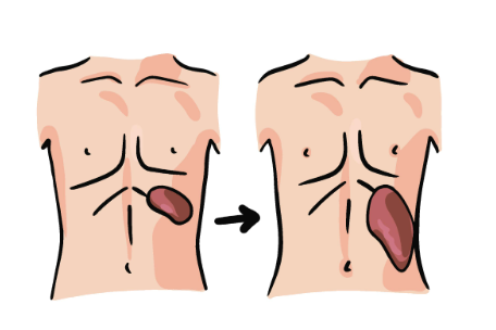 超过80%的非选择性MF患者会出现明显的脾肿大症状,很多病人都是因为体检发现脾肿大而被诊断为MF。其原因是脾做为髓外造血的主要器官之一,它的代偿性造血会使脾肿大。当脾肿大时,会引起脾隔离症,以及导致一系列的腹部症状,如腹部不适、左上腹的疼痛、早起腹胀等。严重的患者还会出现脾梗死[1]。
