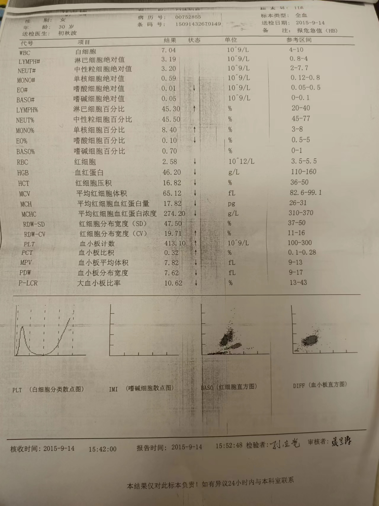 大量失血导致我贫血严重,我的血红蛋白当时最高只有70g/L,返回老家后我开始接受贫血的治疗。在这期间,我做了血常规检查,本以为除了贫血,不会再有什么其他问题了,万万没想到,血常规报告出来后,医生原本带笑的表情一下子就凝固了,他跟我说:“你的血红蛋白不见涨,怎么血小板数值升高了这么多,这不对啊!”