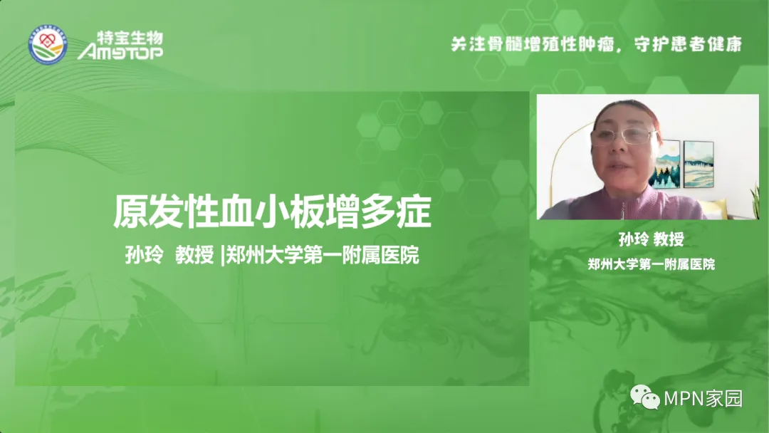 郑州大学第一附属医院孙玲教授作《原发性血小板增多症》专题解读,从原发性血小板增多症的发病机制、常见症状、如何诊断、危险因素、治疗原则、注意事项等多层次多方面进行讲解,深入浅出,增强了患者对于ET的了解,也加深了患者对于疾病的治疗信心。最后孙教授提醒大家规律随访,怀疑疾病进展时一定要及时进行骨髓活检!