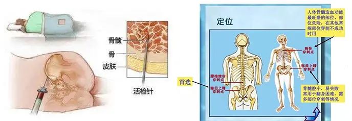 Q: 为什么要做骨髓穿刺? A: 常规的抽血化验只能反映外周成熟血细胞的变化,不能完全反映出造血系统的变化。如白血病的特征为白血病细胞在骨髓中异常增生,必须通过骨髓检查才能诊断,并进行组化染色、免疫分型及基因检查,为治疗及分型提供必需的资料。 Q: 什么情况一定要做骨髓穿刺? A: 骨髓穿刺是血液科常用的采集骨髓液的一种检查手段,是最基本、最重要、最快捷的检查。临床上采集骨髓液常用于血细胞形态学检查,还用于造血干细胞培养、细胞遗传学分析及病原生物学检查等,以协助临床诊断、观察疗效和判断预后等。适用于以下几种情况:(1)各种原因所致的贫血和各类型的白血病、血小板减少症、多发性骨髓瘤、转移癌、骨髓增生异常综合征、骨髓纤维化、恶性组织细胞病;不明原因的全血细胞减少、不明原因白细胞增多或减少、外周血出现分类不明或异常细胞及骨髓增殖性疾病等;(2)某些寄生虫病,如疟疾、黑热病等可检测寄生虫;(3)长期不明原因发热,肝、脾、淋巴结肿大均可行骨髓穿刺检查,以明确诊断;(4)评估某些疾病的疗效。 Q: 哪些人不能做骨髓穿刺? A: 血友病患者、严重凝血功能障碍、穿刺部位有炎症或者明显畸形者不建议做骨髓穿刺。穿刺部位有局部化脓感染者,一定要选择其他无感染部位进行穿刺进行。 Q: 骨髓穿刺在什么部位做? A: 骨髓穿刺可选择的穿刺点有髂前上棘、髂后上棘、胸骨柄、腰椎棘突,临床上最常选择的部位是髂后上棘,几个穿刺部位各有特点: (1)髂后上棘:无论儿童还是成人,髂后上棘均为首选部位,因为此处红骨髓含量较多,且骨面较平进针容易,非承重部位创伤小易愈合。 (2)髂前上棘:此处骨质较硬不易进针,邻近腹腔穿刺易损伤重要脏器等原因,推荐不适合髂后上棘穿刺者选择该处进行穿刺。 (3)腰椎棘突:具有棘突骨性标志明显,体位易固定,造血活跃等优点,但因腰椎为活动部位有骨折风险,患儿哭闹时穿刺针可能会伤及周围神经,因此不作为首选穿刺部位。 (4)胸骨柄:骨面平坦,骨髓造血成分丰富,但骨质较薄,操作不当可能伤及心脏大血管,另外小婴儿骨髓腔较小,穿刺技术要求高,需慎重选择。 (5)胫前:年龄限定<2岁婴幼儿。优点为骨面平易定位,缺点为该处为承重部位有骨折风险,活动部位影响伤口愈合。并且年长儿长骨骨髓逐渐转变为黄骨髓,因此该部位不适合年长儿。