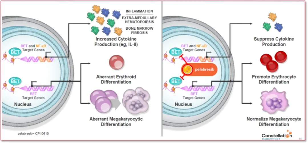 溴结构域和末端外结构域(BET)蛋白家族包括四种蛋白(BRD2,BRD3,BRD4和BRDT),它们具有表观遗传修饰因子的功能,能够调控一系列异常致癌信号的基因表达途径。Pelabresib是一种BET抑制剂,它可以选择性地与BET蛋白结合,降低癌症中异常表达基因的表达,从而抑制肿瘤的发生发展。目前BET抑制剂已被证明可以靶向多种MF驱动机制,与JAKi联合治疗具有协同作用[1]。